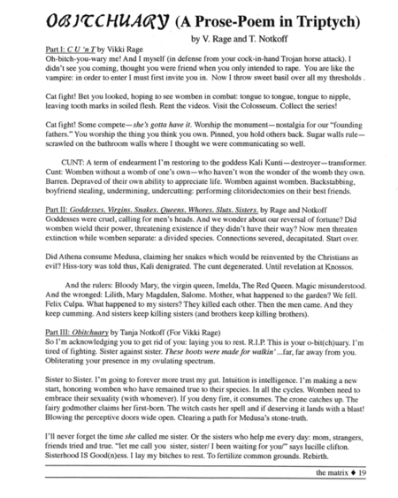 The Matrix: The Humboldt State Women’s Center Publication, Issue 2, Arcata, CA, Spring 1998, Black and White Cover Photo, “Storming the Cave” poem pg 11 (as Tanja Notkoff), Background graphic pgs 10-11, from original papercut (as Tanja Notkoff), “Obitchuary (A Prose-Poem in Triptych)” pg 19 (as V. Rage and T. Notkoff)